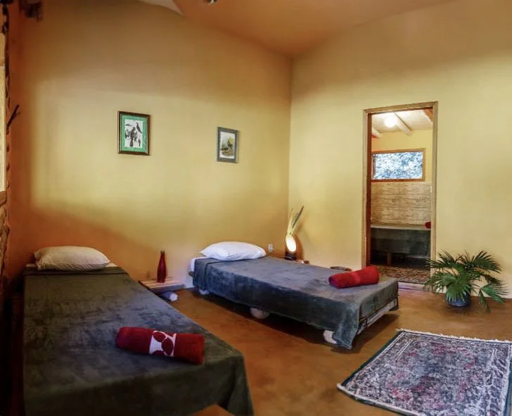 The room features three beds and a private bathroom, making it ideal for a comfortable and mindful eco-retreat stay.